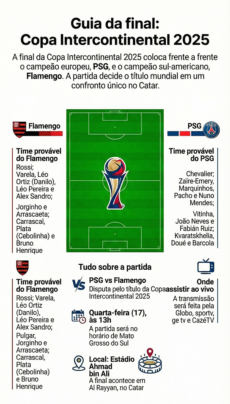 A decisão da Copa Intercontinental 2025 entre Flamengo e Paris Saint-Germain (PSG) acontece nesta quarta-feira (17), às 13h (horário de MS), no Estádio Ahmad bin Ali, no Catar, e será transmitida ao vivo em diferentes plataformas.