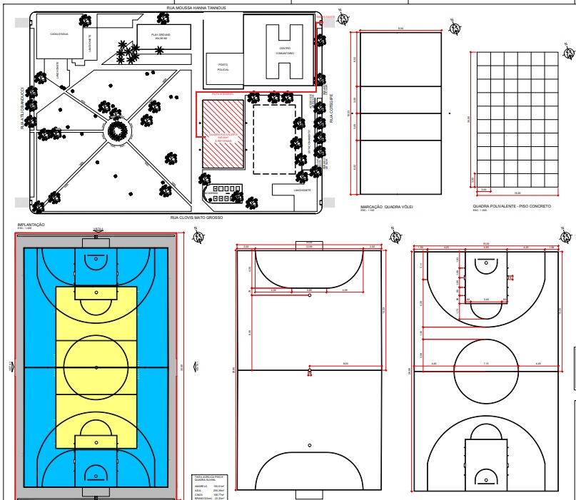 O alambrado também será substituído por telas com arame galvanizado de maior resistência, além de pintura em toda a estrutura metálica. A quadra ainda contará com novas estruturas para basquete, traves de futebol tratadas com anticorrosivo e a execução de mureta de segurança atrás das traves.
