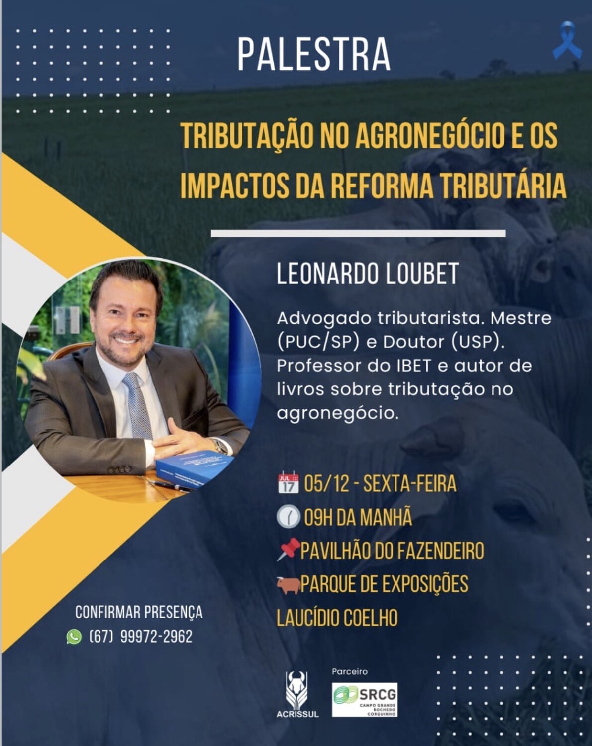 A palestra, intitulada “Tributação no Agronegócio e os Impactos da Reforma Tributária”, é promovida pela ACRISSUL (Associação dos Criadores de Mato Grosso do Sul) em parceria com o SRCG (Sindicato Rural de Campo Grande), entidades que reforçam a necessidade de o setor se antecipar e compreender as novas regras que afetam diretamente a produção, a comercialização e os investimentos no campo.