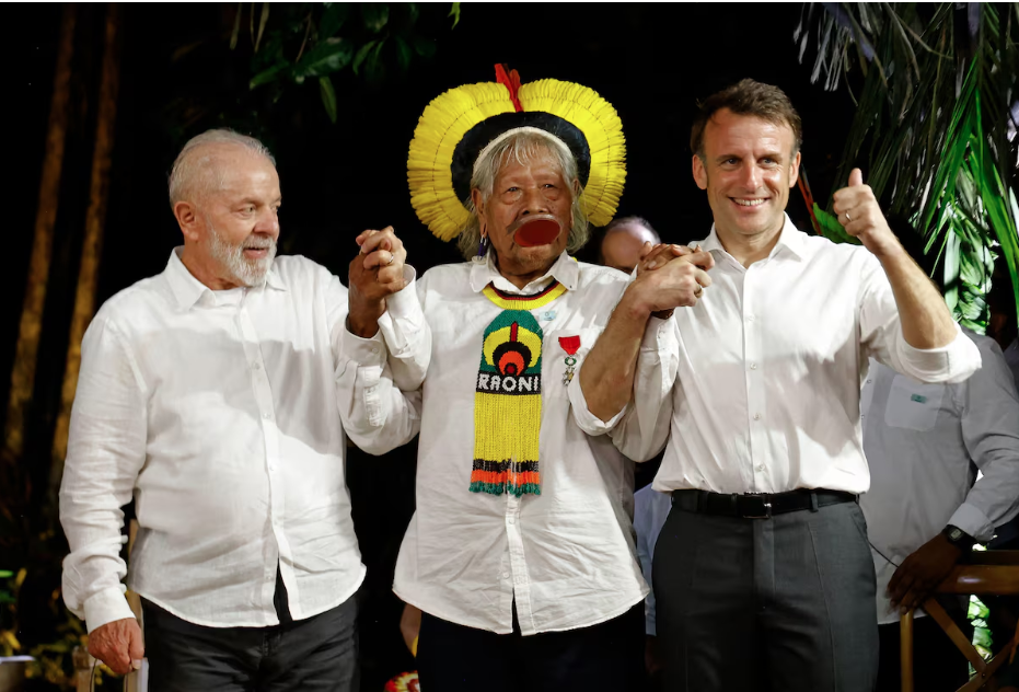 O presidente francês apontou que o cacique atua como um embaixador dos direitos dos indígenas e da proteção da Amazônia, interlocutor de governos e um "sentinela do seu território", enquanto Lula clicava fotos de ambos.