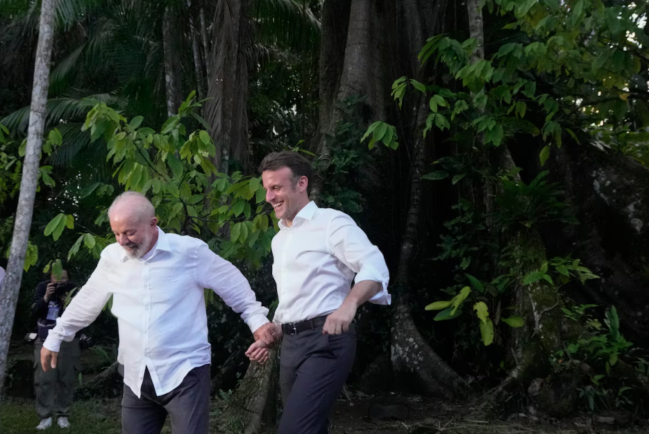 O presidente francês desembarcou em Belém na terça-feira e foi recebido por Lula. Os dois presidentes visitaram a Ilha do Combu para conhecer a produção artesanal de cacau. Na ilha, Macron condecorou o líder indígena Cacique Raoni, da etnia Kaiapó, com a medalha da Ordem Nacional da Legião de Honra, a mais alta condecoração da França e prometeu apoiar a causa indígena.