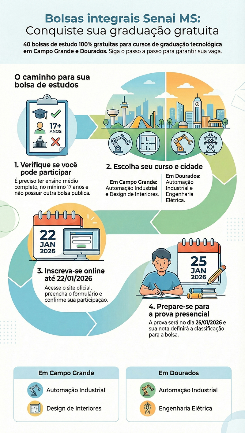 Quem busca uma graduação gratuita já pode se inscrever no processo seletivo do Senai, que está oferecendo 40 bolsas integrais em Mato Grosso do Sul. As vagas são para cursos em Campo Grande e Dourados, e as inscrições seguem até o dia 22 de janeiro de 2026.