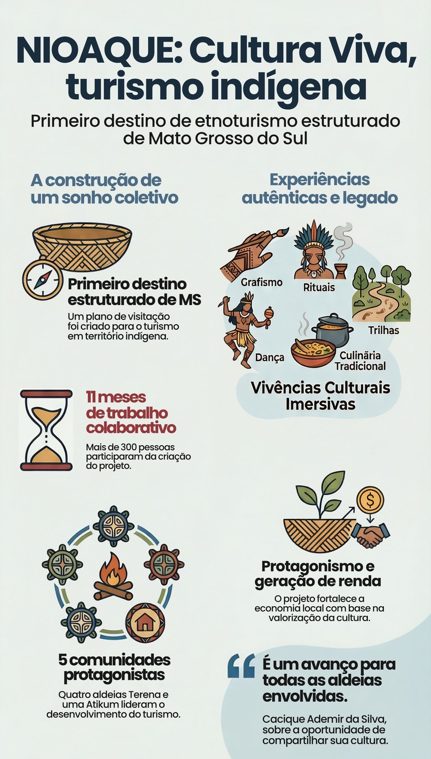 O plano prevê roteiros guiados, trilhas na mata, vivências culturais, hospedagem comunitária, gastronomia típica e a possibilidade de integração com a natureza e o modo de vida tradicional. A intenção é transformar Nioaque no primeiro destino de turismo indígena estruturado de Mato Grosso do Sul. A aprovação oficial depende agora da anuência da FUNAI.