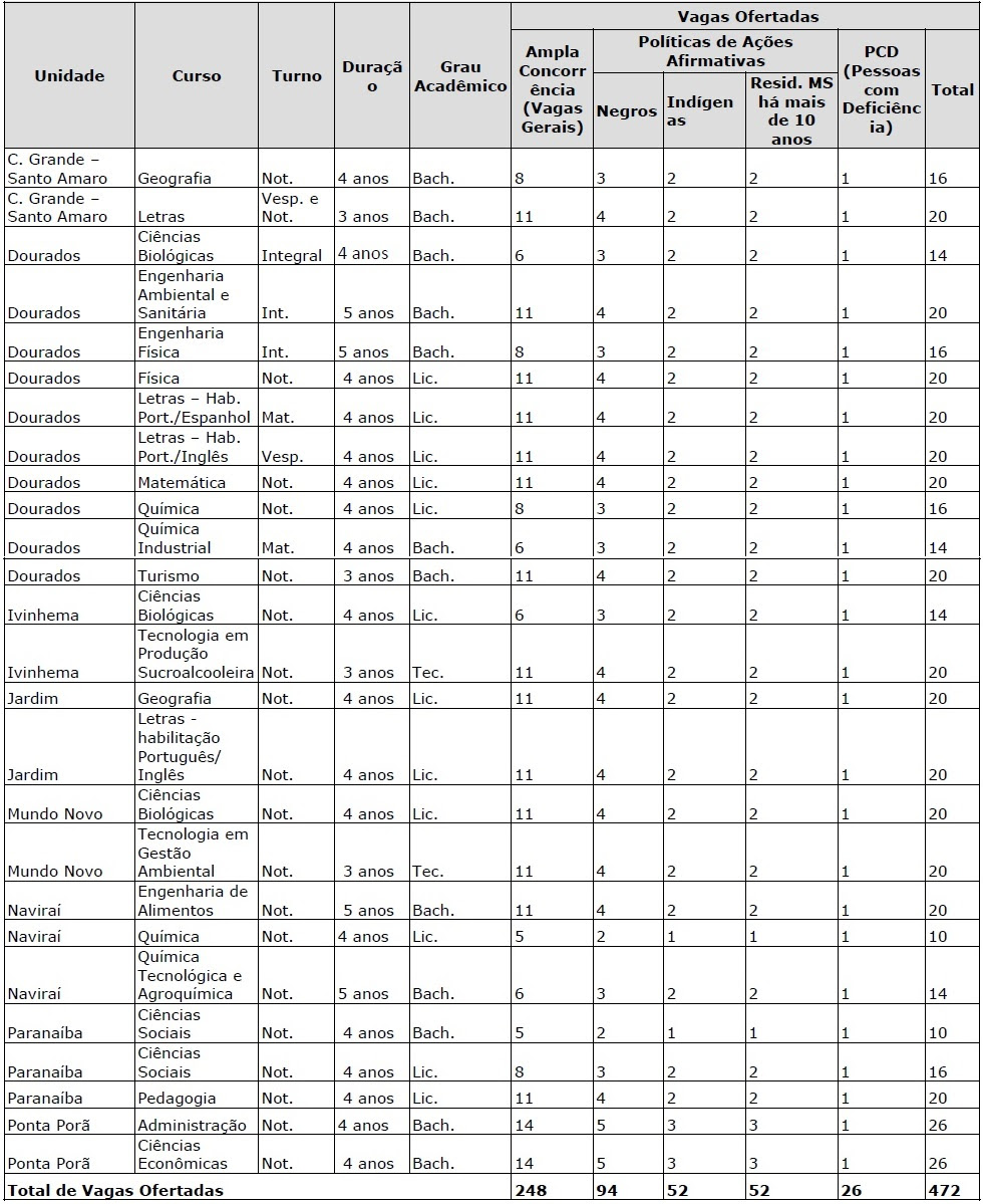 Ao todo, são ofertadas 472 vagas, distribuídas em 22 cursos de graduação e nove unidades universitárias da UEMS. As oportunidades estão localizadas nos municípios de Campo Grande, Dourados, Ivinhema, Jardim, Mundo Novo, Naviraí, Paranaíba e Ponta Porã.