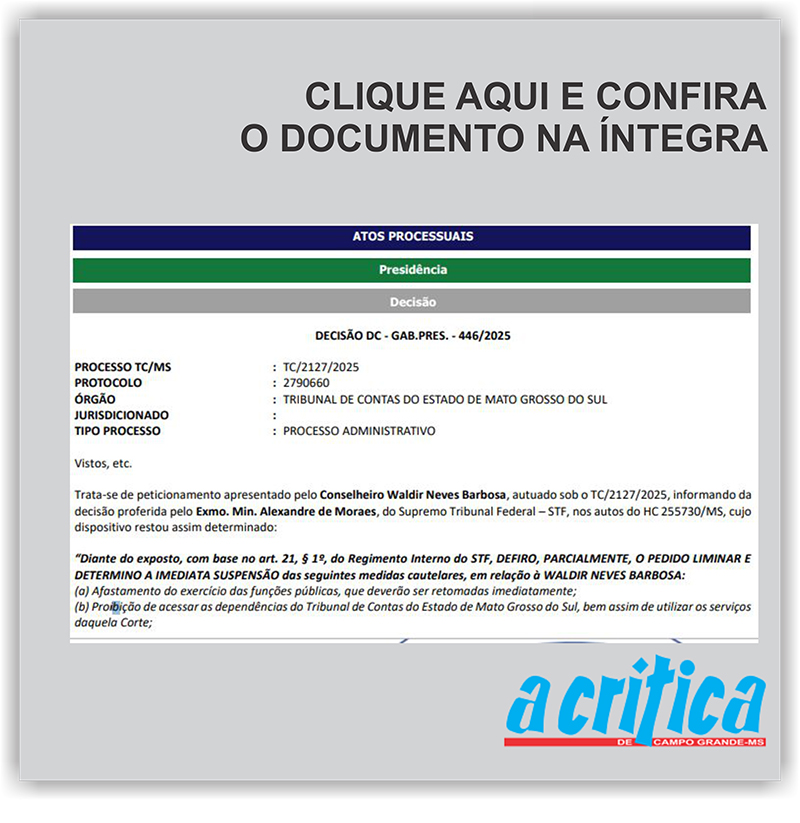 O retorno de Waldir Neves ao cargo de conselheiro do Tribunal de Contas de Mato Grosso do Sul (TCE/MS) foi oficialmente publicado nesta quarta-feira (14) no Diário Oficial da Corte, após determinação do Supremo Tribunal Federal (STF). Como já noticiado pelo portal A Crítica, a reintegração ocorre em cumprimento à decisão do ministro Alexandre de Moraes, que suspendeu as medidas cautelares que impediam o conselheiro de exercer suas funções.