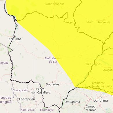 Entre os municípios sob aviso estão Três Lagoas, Dourados, Coxim, Aquidauana, Corumbá, Nova Andradina, Costa Rica, Paranaíba, Bataguassu, Chapadão do Sul, Cassilândia, Selvíria, São Gabriel do Oeste e Água Clara. A região de Campo Grande também está incluída.