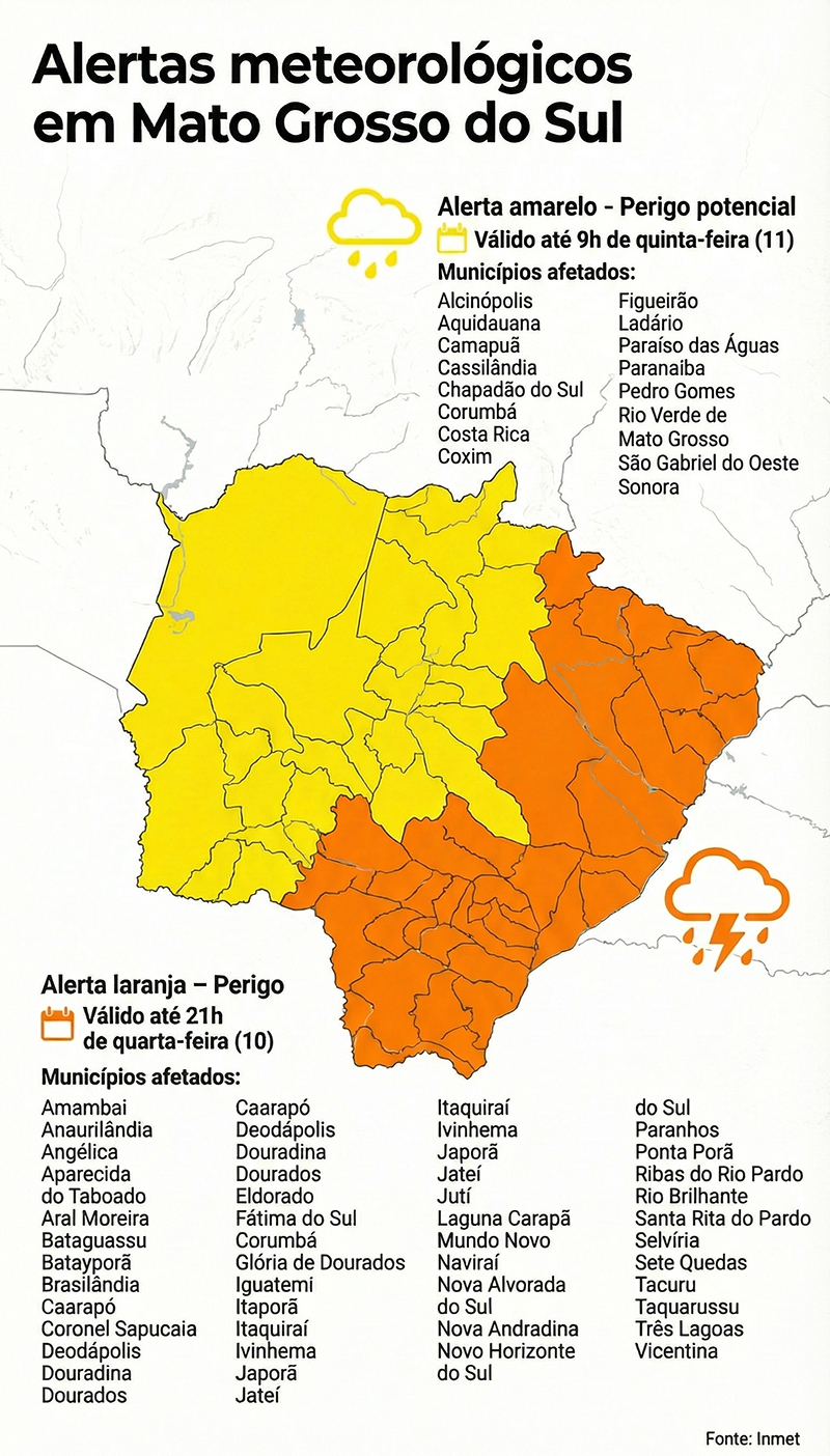 Moradores de dezenas de cidades de Mato Grosso do Sul devem redobrar os cuidados nesta quarta-feira (10). O Instituto Nacional de Meteorologia (Inmet) emitiu dois alertas: um de chuvas intensas, que segue até as 9h desta quinta-feira (11), e outro de vendaval, válido até às 21h de hoje.