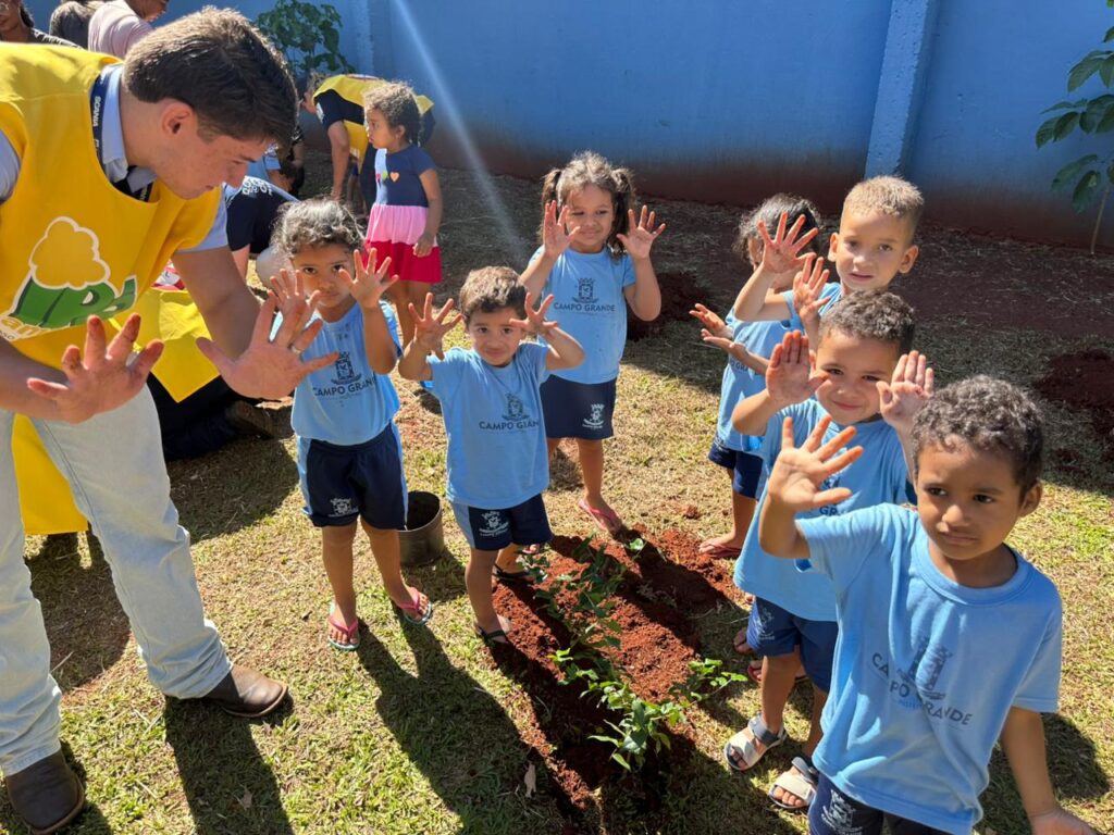 Crianças participaram do plantio de mudas frutíferas na Emei Piratininga, que agora abriga o primeiro Pomar Urbano de Campo Grande. (Foto: Reprodução SECOM CG)