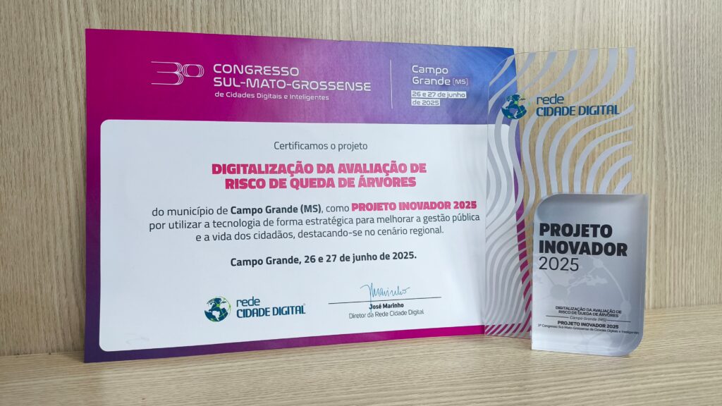 Em junho, Campo Grande também foi premiada no 3º Congresso Sul-Mato-Grossense de Cidades Digitais e Inteligentes com o Prêmio Projeto Inovador 2025. O destaque foi a digitalização do processo de avaliação de risco de queda de árvores e o uso do sistema Arbolink, ferramenta que permite mapear, analisar e apoiar decisões técnicas sobre o patrimônio arbóreo da cidade.
