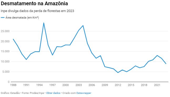 É a primeira vez desde 2019 que a taxa de desmate fica abaixo de 10 mil km². O governo tem apontado o aumento da capacidade de fiscalização federal em campo na ordem de quase 200% e a retomada na aplicação de multas como fatores que contribuíram para a queda da devastação da floresta.