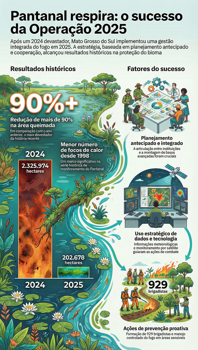 Bases avançadas foram montadas antes da estiagem, brigadas foram treinadas em larga escala e uma força-tarefa interinstitucional foi acionada com meses de antecedência. O resultado fez com que MS registrasse o menor número de focos de calor desde 1998 e uma queda de mais de 90% na área queimada em relação ao ano anterior.