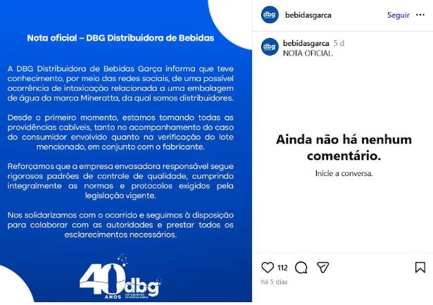 A empresa DBG Distribuidora de Bebidas Garça, responsável pela marca Mineratta, comunicou que tomou conhecimento do caso pelas redes sociais e acompanha o desenrolar da investigação. Em nota, reiterou que segue normas de controle de qualidade, enquanto colabora com os órgãos competentes.