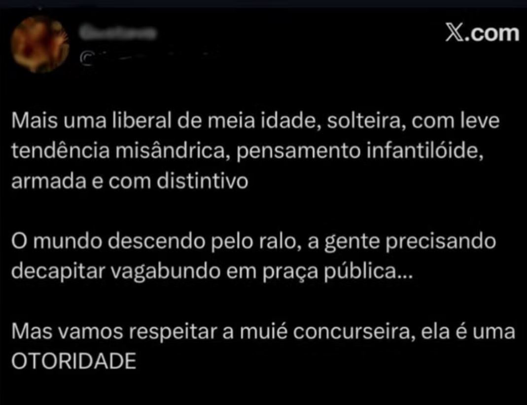 Postagem descriminatoria contra a delegada que tomou posse. Foto: Reprodução XAlém do discurso de ódio direcionado ao papel da mulher no serviço público, os ataques avançaram para o campo pessoal. Comentários fizeram insinuações sobre a vida privada e a saúde mental da delegada, associando sua idade, estado civil e até sua capacidade profissional a estereótipos ofensivos. Uma das mensagens dizia: “Ai é complicado, imagina o tanto de dilemas mentais essa mulher deve ter”. Outra ironizava: “Pra chegar solteira aos 30, espero que ela aprenda a lidar com o PCC melhor do que lidou com homens”.