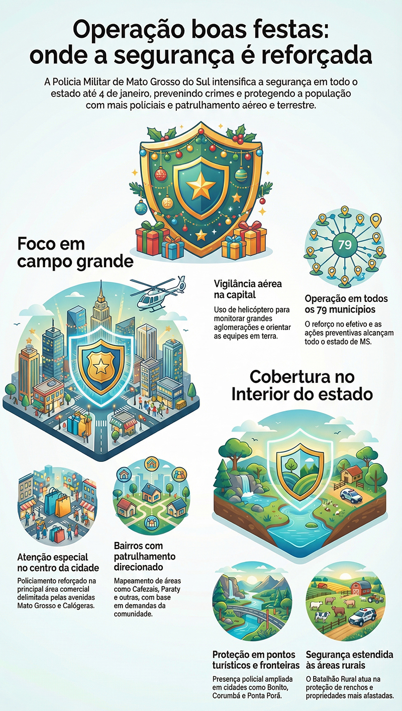 A ação segue até 4 de janeiro e vai garantir segurança à população durante o período de festas, com reforço expressivo do efetivo, policiamento aéreo e intensificação da presença nas ruas. O foco principal está na prevenção de delitos, na redução de índices criminais e na proteção de áreas de grande circulação em Campo Grande e no interior.