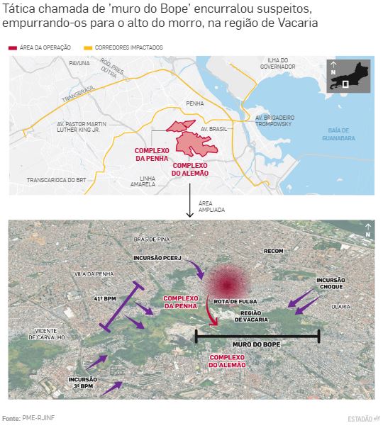 Os confrontos ocorreram em uma área densamente povoada e com geografia desafiadora. No Complexo do Alemão vivem cerca de 54 mil pessoas, e no bairro da Penha, mais de 58 mil. Ruas estreitas e construções irregulares dificultam a entrada das forças de segurança.