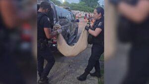 Homem é preso por policial e conduzido algemado até viatura em frente a residência durante operação policial.