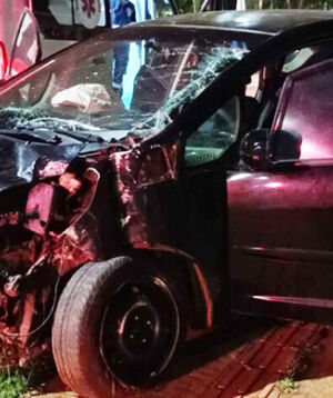 Carro destruído após colisão em avenida de condomínios de luxo, em Dourados