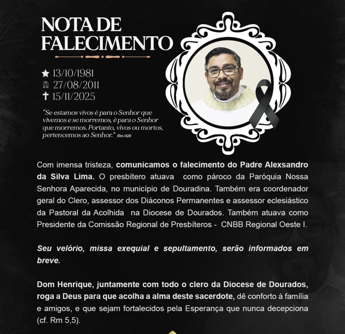 O padre Alexsandro da Silva Lima, 44 anos, da Paróquia Nossa Senhora Aparecida, em Douradina, foi localizado morto na tarde deste sábado (15) em uma área de mata no Distrito Industrial de Dourados. Ele havia desaparecido na noite anterior.