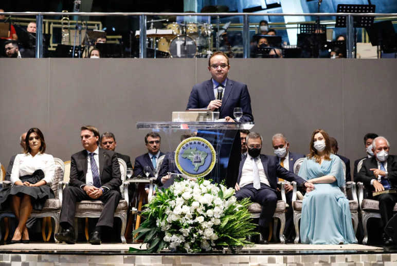O presidente Jair Bolsonaro e o ministro do STF André Mendonça participam de culto em ação de graças com o bispo Abner Ferreira. Foto: Alan Santos/ PR