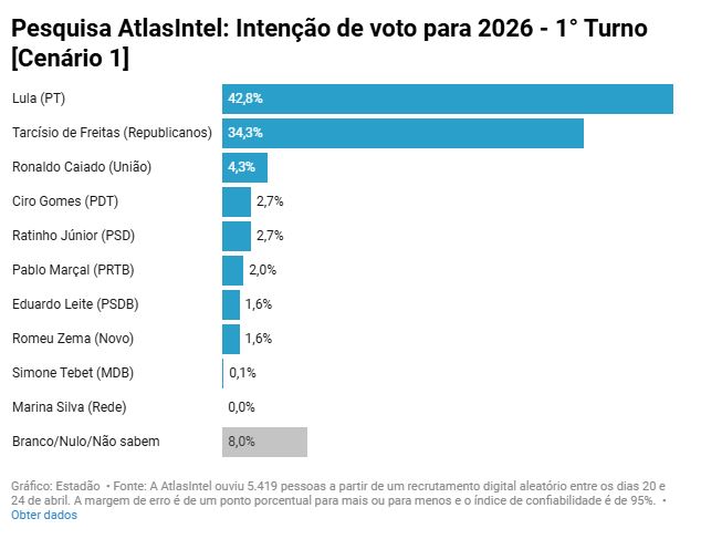 Em um cenário de primeiro turno com Tarcísio, Lula tem 42,8% das intenções de voto e o governador de São Paulo, 34,3%. Na sequência, aparecem o governador de Goiás, Ronaldo Caiado (União), com 4,3%. O ex-ministro da Integração Nacional Ciro Gomes (PDT) e o governador do Paraná, Ratinho Júnior (PSD), têm 2,7%, cada. Inelegível pela segunda vez após decisão da Justiça Eleitoral de São Paulo deste domingo, 27, o ex-coach Pablo Marçal (PRTB) registra 2% na sondagem.