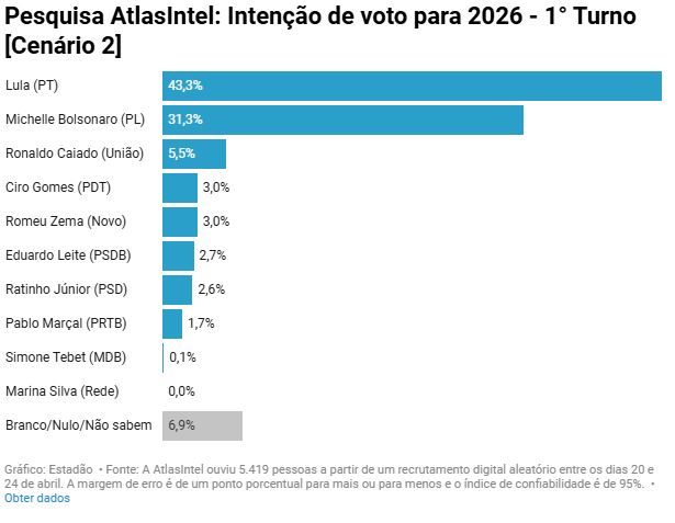 Pesquisa do instituto AtlasIntel divulgada nesta segunda-feira, 28, mostra que o presidente Luiz Inácio Lula da Silva (PT) lidera em cenários das eleições de 2026 com o governador de São Paulo, Tarcísio de Freitas (Republicanos), e a ex-primeira-dama Michelle Bolsonaro (PL) como adversários.