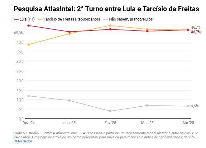 Em um eventual segundo turno contra Tarcísio, Lula e o governador paulista possuem os mesmos 46,7%. Outros 6,6% não sabem em quem votariam ou declararam voto em branco ou nulo. No levantamento anterior da AtlasIntel, divulgada no dia 1.° de abril, o governador tinha 47% enquanto o presidnete, 46%.