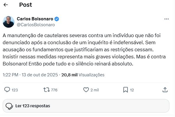 Carlos Bolsonaro classificou a decisão como uma "grave violação" e afirmou que a manutenção das medidas cautelares contra o pai é "indefensável".