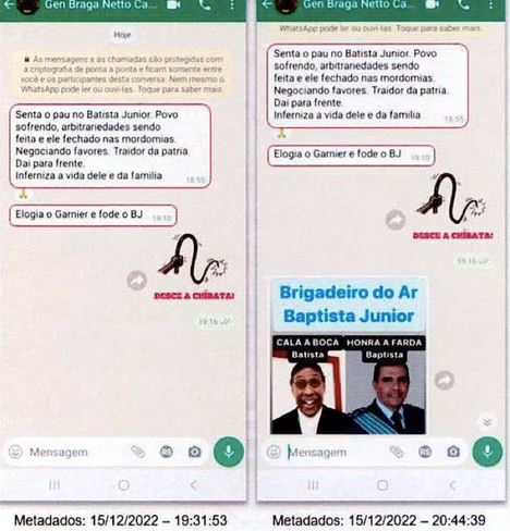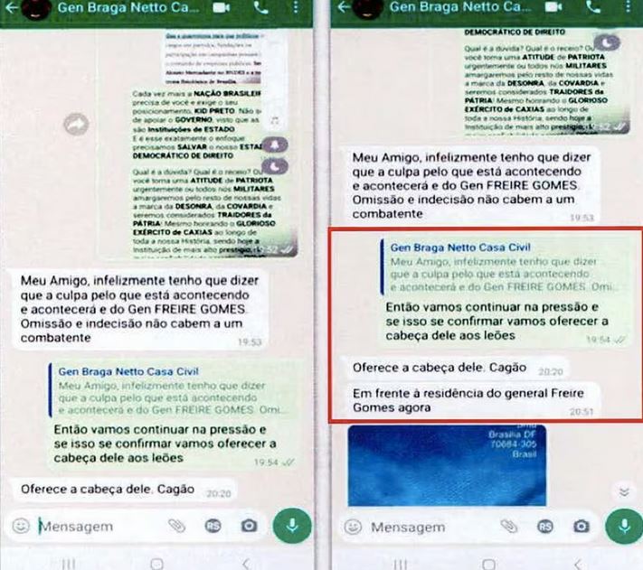 Em um dos diálogos, em dezembro de 2022, Braga Netto afirma que a "culpa pelo que está acontecendo e acontecerá é do general Freire Gomes". "Omissão e indecisão não cabem a um combatente", acrescenta o ministro. "Oferece a cabeça dele. Cagão."