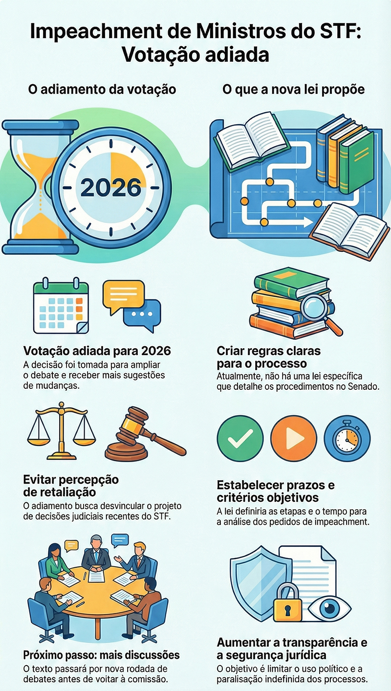 O Senado adiou para 2026 a votação do projeto que atualiza a lei de impeachment no Brasil, com foco em regras para o afastamento de ministros do Supremo Tribunal Federal (STF). A proposta, de autoria do presidente do Senado, Rodrigo Pacheco (PSD-MG), estava na pauta da Comissão de Constituição e Justiça (CCJ), mas o relator, senador Weverton Rocha (PDT-MA), pediu mais tempo para discutir o texto.