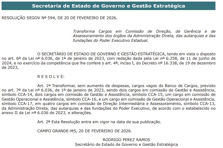 A resolução é assinada pelo secretário de Estado de Governo e Gestão Estratégica, Rodrigo Perez Ramos, e foi publicada com data de 20 de fevereiro de 2026.