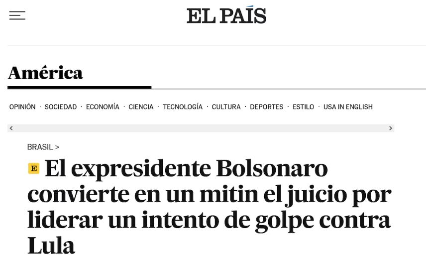 Ex-presidente Bolsonaro converte em comício o julgamento de um golpe contra Lula', destaca o El País, da Espanha - Foto: Reprodução/El PaísA rádio americana NPR descreveu o julgamento sobre a tentativa de golpe como "histórico". "É a primeira vez na história do Brasil que um ex-chefe de Estado está sendo julgado por tentar derrubar o governo", registrou a emissora dos Estados Unidos. Moraes é apresentado na reportagem como uma "figura polarizadora" que enfrenta críticas de Bolsonaro, do empresário Elon Musk e do presidente dos EUA, Donald Trump.