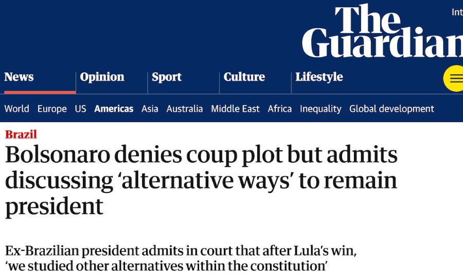 O jornal britânico The Guardian destacou que, embora tenha negado a tentativa de golpe, Bolsonaro admitiu ter avaliado dispositivos da Constituição para contestar o resultado da eleição. "Estudamos possibilidades outras dentro da Constituição. Ou seja, jamais saindo das quatro linhas", disse Bolsonaro durante o interrogatório.