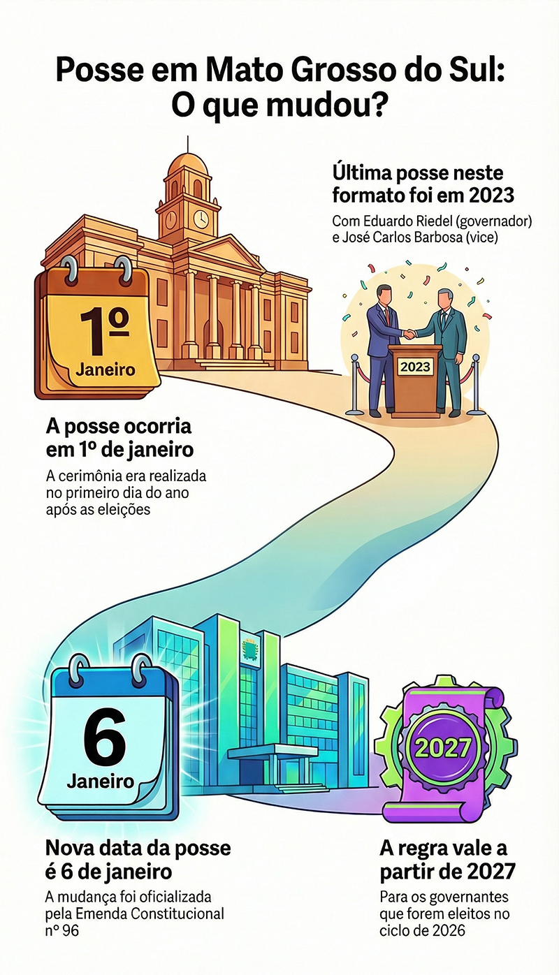 A data da posse do governador e do vice-governador de Mato Grosso do Sul foi oficialmente alterada. Foi publicada no Diário Oficial do Estado desta quinta-feira (11) a Emenda Constitucional nº96, que modifica o Artigo 88 da Constituição estadual para transferir a cerimônia de 1º de janeiro para o dia 6 de janeiro do ano seguinte às eleições.