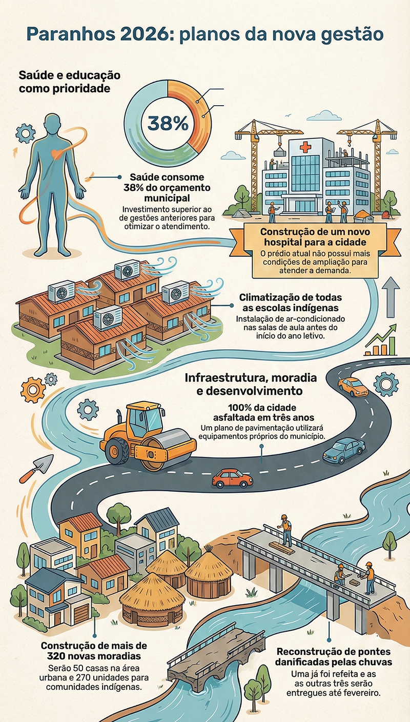 Heliomar anunciou ainda um plano de pavimentação urbana que prevê o uso de uma “patrulha do asfalto”, com equipamentos próprios do município. “Se fizermos seis ou sete ruas por ano, em três anos a cidade estará 100% asfaltada”, estimou. O prefeito também confirmou a construção de 50 novas casas na área urbana e 270 moradias nas comunidades indígenas, totalizando mais de 320 unidades habitacionais.