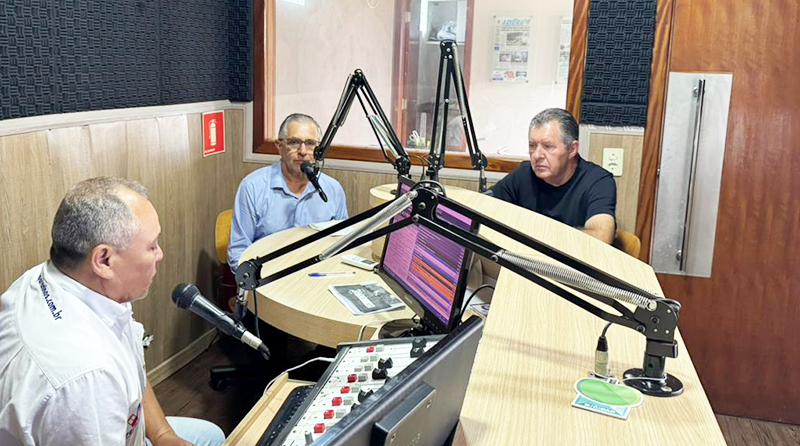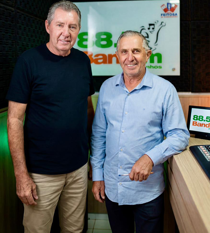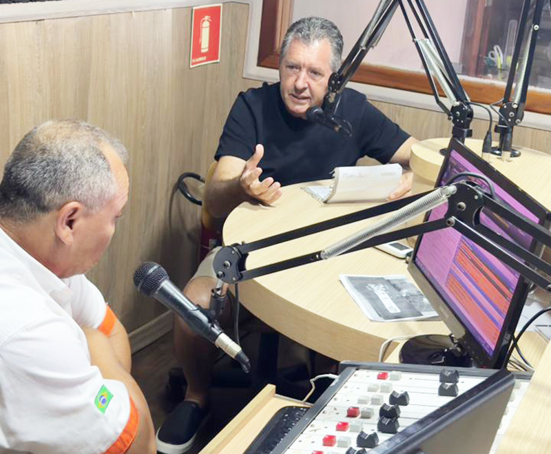 Prefeito Heliomar Klabunde e o vice Alfredo durante entrevista à Band FM de ParanhosSaúde é prioridade - Ao ser questionado sobre as áreas mais urgentes, Klabunde foi direto: “A prioridade sempre foi a saúde”. O prefeito revelou que o setor consome 38% do orçamento municipal, índice bem acima do que o município aplicava em gestões anteriores.