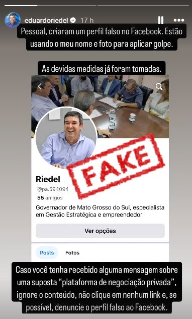 A mensagem foi divulgada nos stories do Instagram oficial de Riedel. Na postagem, ele pediu que os seguidores ignorem qualquer conteúdo desse tipo, evitem clicar nos links e denunciem o perfil diretamente ao Facebook. Apesar do aviso, o governador não deu detalhes sobre o tipo de golpe envolvido nem se houve registro de vítimas.