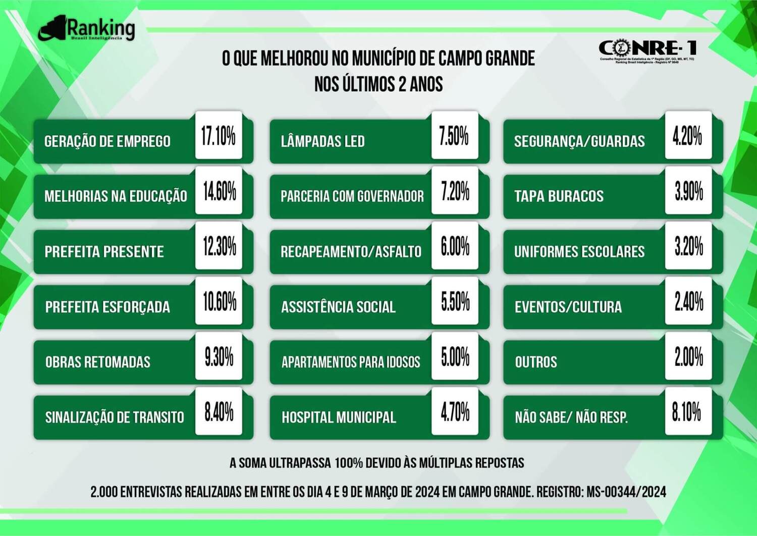 A pesquisa encomendada pelo Diário MS News e registrada no Tribunal Superior Eleitoral sob o número MS-00344/2024. O estudo, conduzido entre 4 e 9 de março com 2 mil moradores das sete regiões urbanas da Capital sul-mato-grossense.