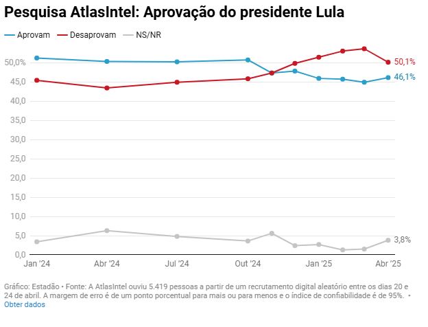 Pesquisa divulgada pelo instituto AtlasIntel nesta segunda-feira, 28, mostra que 50,1% dos brasileiros desaprovam o desempenho do presidente Luiz Inácio Lula da Silva (PT) no comando do País. Outros 46,1% aprovam a atuação do petista. Não souberam responder 3,8%.