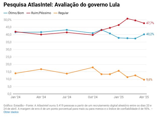 A última vez que a desaprovação do petista esteve abaixo dos 50% foi em dezembro do ano passado. Por outro lado, uma aprovação acima dos 50% não é registrada desde outubro de 2024.