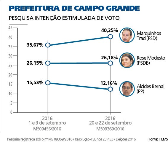 Na última semana para as eleições, nova rodada da pesquisa do Ipems (Instituto de Pesquisas de Mato Grosso do Sul Ltda.), contratada pelo jornal Correio do Estado, mostra a situação dos eleitores em relação aos candidatos na disputa pela Prefeitura de Campo Grande. O quadro indica crescimento do candidato Marquinhos Trad (PSD), com a segunda colocada nas intenções de votos, Rose Modesto (PSDB), mantendo-se estável e um recuo do prefeito Alcides Bernal (PP)