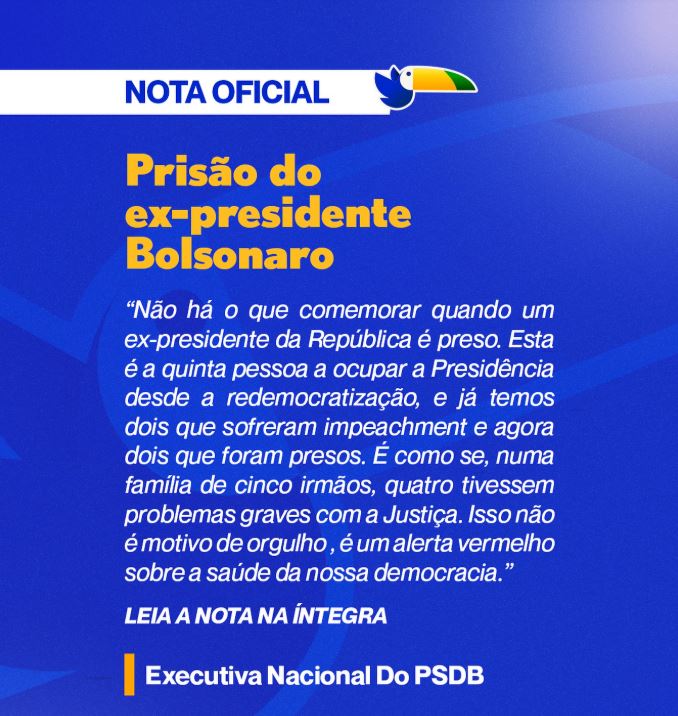 A executiva nacional do PSDB divulgou nota neste sábado (22) em que expressa preocupação com a prisão preventiva do ex-presidente Jair Bolsonaro (PL), decretada pelo ministro Alexandre de Moraes, do Supremo Tribunal Federal (STF). “Não há o que comemorar quando um ex-presidente da República é preso”, diz o texto.