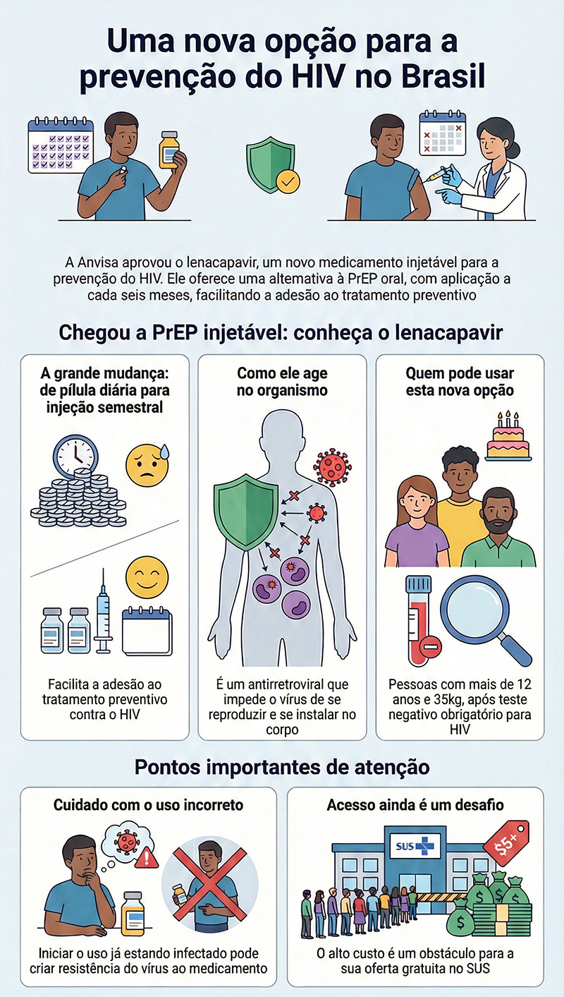 A prevenção contra o HIV passa a contar com uma nova alternativa no Brasil. A Agência Nacional de Vigilância Sanitária (Anvisa) aprovou o uso do lenacapavir como forma de profilaxia pré-exposição (PrEP), estratégia voltada a reduzir o risco de infecção pelo vírus em pessoas que ainda não têm o HIV.