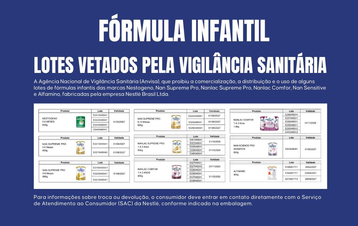 De acordo com a Anvisa, o recolhimento envolve apenas lotes específicos das marcas Nestogeno, Nan Supreme Pro, Nanlac Supreme Pro, Nanlac Comfor, Nan Sensitive e Alfamino, todas fabricadas pela Nestlé Brasil. A medida não afeta outros produtos dessas marcas que não estejam incluídos nos lotes listados pela agência.