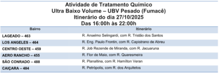 De acordo com a Coordenadoria de Controle de Endemias Vetoriais (CCEV), as equipes circularão das 16h às 22h, passando pelos bairros Lageado, Los Angeles, Centro Oeste, Aero Rancho, São Conrado e Caiçara.