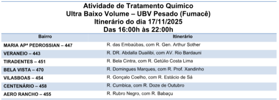 A borrifação, realizada por equipes da Coordenadoria de Controle de Endemias Vetoriais (CCEV), da Secretaria Municipal de Saúde (Sesau), ocorrerá entre 16h e 22h nos bairros Maria Aparecida Pedrossian, Jardim Veraneio, Tiradentes, Jardim Bela Vista, Vilas Boas, Centenário e Aero Rancho.