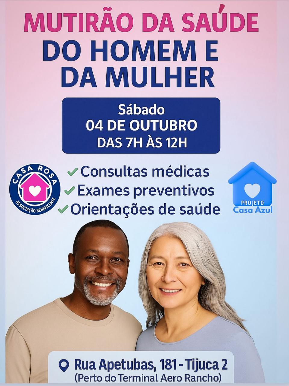 30/10 (quarta) – 13h às 17h: USF Vila NasserLocal fixo da Casa Rosa: Rua Apetubas, 181 – Bairro Tijuca II