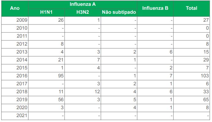 Até o último boletim divulgado na última quarta-feira (15) pela Secretaria Estadual de Saúde (SES), Mato Grosso do Sul não tinha nenhum caso confirmado de Influenza. Em 2020, foram três mortes de H1N1 e nenhuma do H3N2. Já em 2019 a situação foi diferente, com 56 mortes pela H1N1 e três por H3N2.