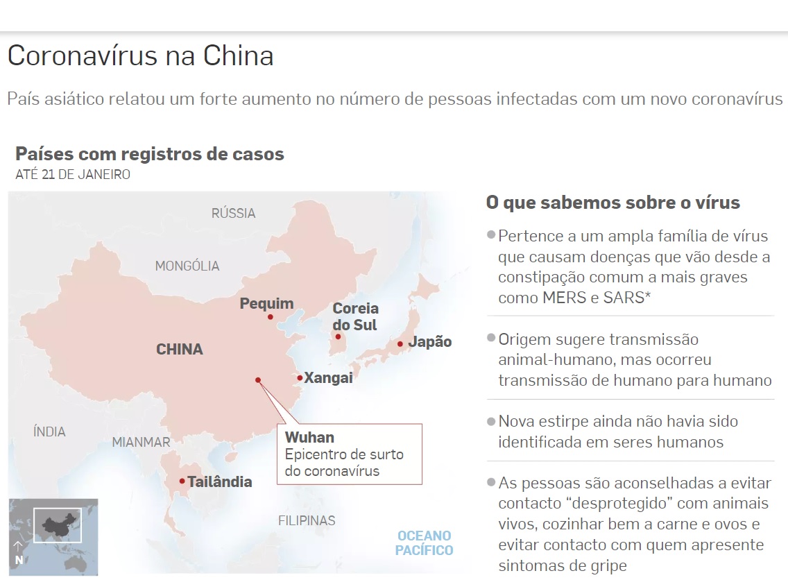 A Organização Mundial da Saúde (OMS) confirmou que se trata de uma nova cepa de coronavírus que foi identificada na cidade de Wuhan, na província de Hubei, e que já se espalhou para outras partes da nação mais populosa do mundo. Pouco se sabe sobre o novo vírus e sua origem.