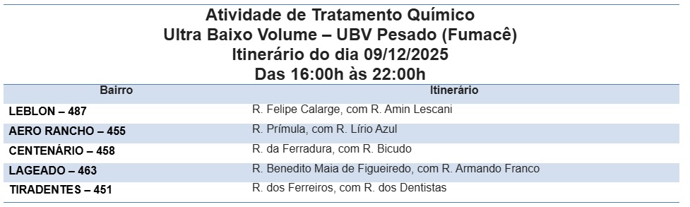 Equipes da Gerência de Controle de Endemias Vetoriais (GCEV), da Secretaria Municipal de Saúde (Sesau), vão circular das 16h às 22h pelas regiões do Leblon, Aero Rancho, Centenário, Lageado e Tiradentes.