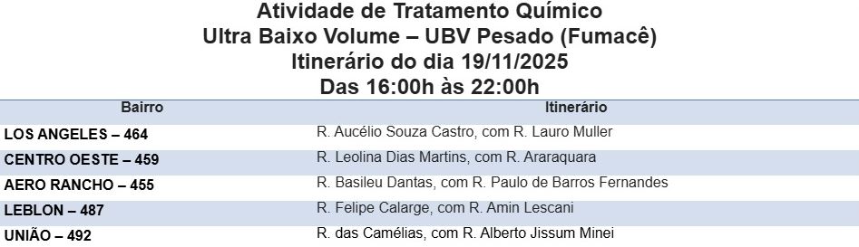 As equipes da Gerência de Controle de Endemias Vetoriais (GCEV), da Secretaria Municipal de Saúde (Sesau), circularão das 16h às 22h pelos bairros Los Angeles, Centro Oeste, Aero Rancho, Leblon e União.